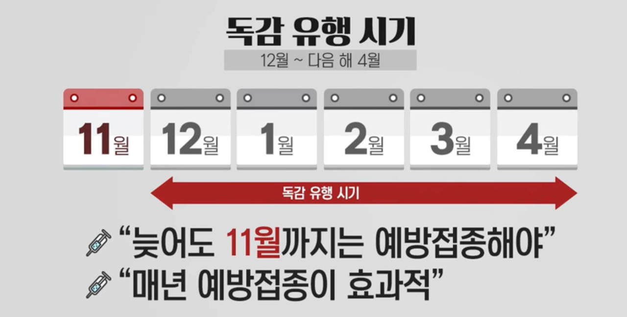 독감이 유행하는 12월, 항체가 생기기위해 2주전인 11월 중순전까지 맞는게 좋습니다.